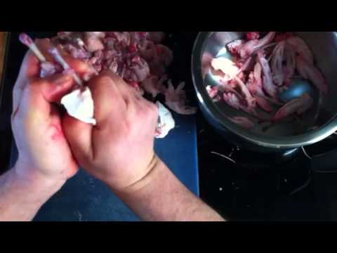 - Nettoyez les ailes de poulet. Retirer les éventuelles plumes avec des pincettes. Si nécessaire, brûler les plumes plus petites avec un chalumeau de cuisine.